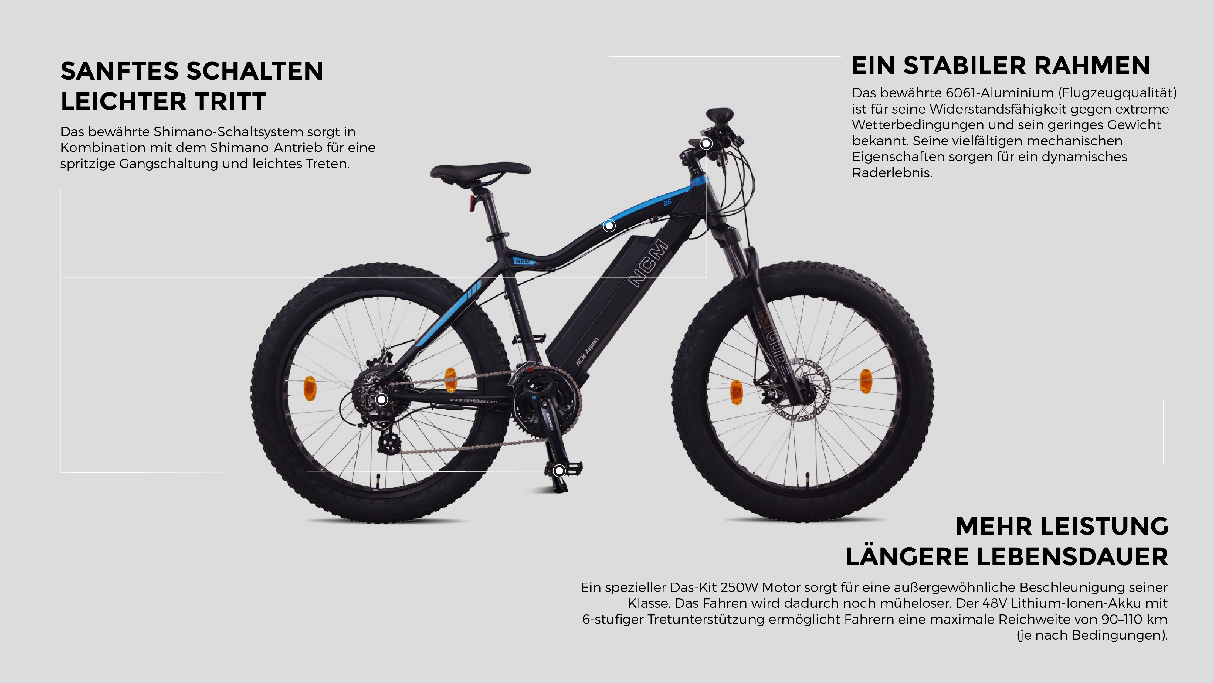 ROBUSTE FAT-BIKE-KONSTRUKTION FÜR MEHR SICHERHEIT: Das Design des NCM Aspen ist sportlich, funktional und sicher. Mit Aluminiumrahmen, mechanischen Tektro-Scheibenbremsen, einer speziellen, einstellbaren RST-Fatbike-Gabel sowie extra breiten Felgen und Reifen genießen Sie Komfort und Stabilität unter allen Bedingungen und auf jedem Terrain.