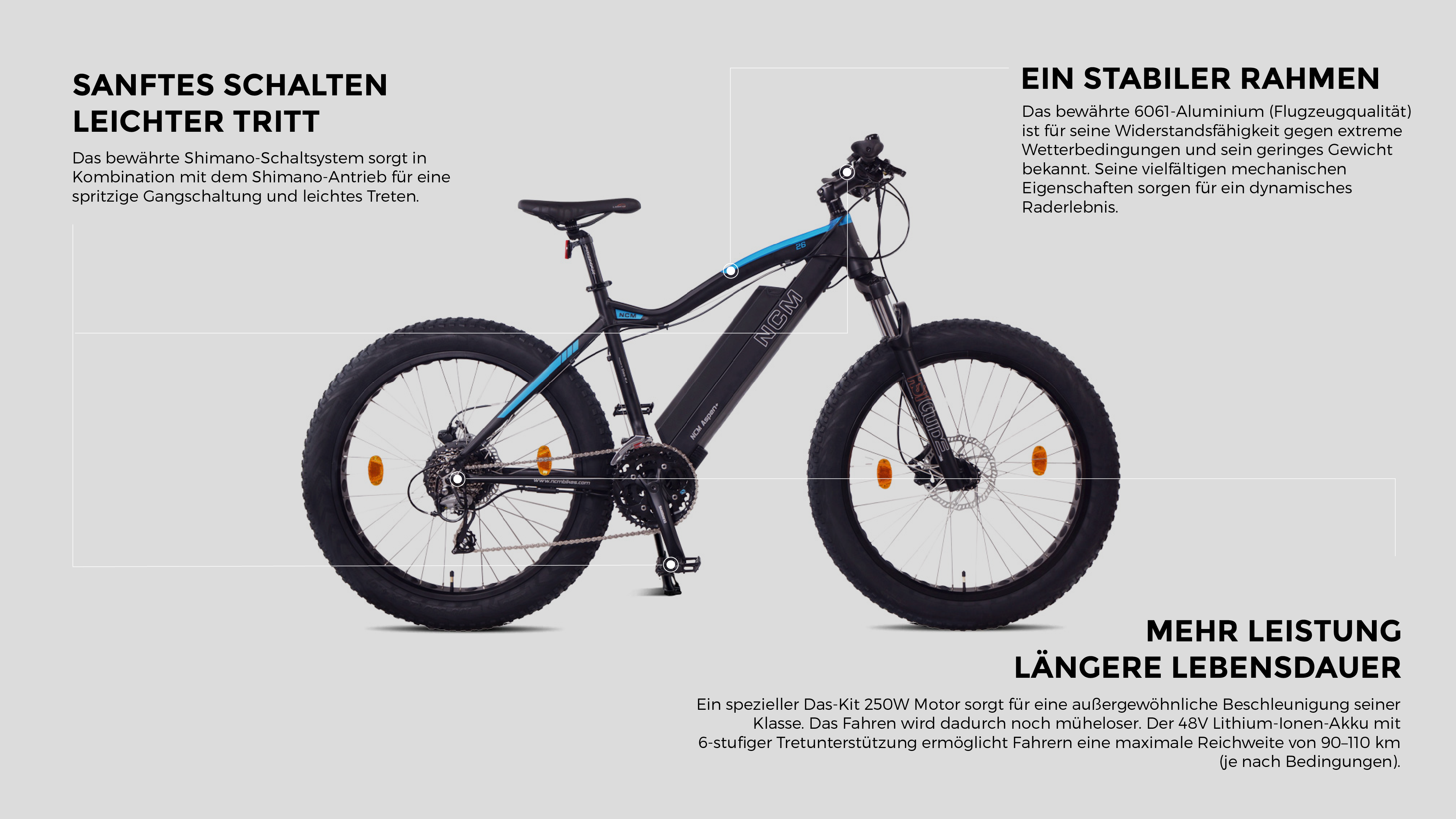 Für alle, die immer mehr wollen, ist das NCM Aspen Plus die leistungsstärkere Version des NCM Aspen (mit stärkerem Akku, LCD-Display, 24 Gängen usw.). Ob auf unebenen Waldwegen, im Sand oder im Schnee – dieses E-Fatbike ist in seinem Element. Es ist der perfekte Begleiter für abenteuerlustige Fahrer.