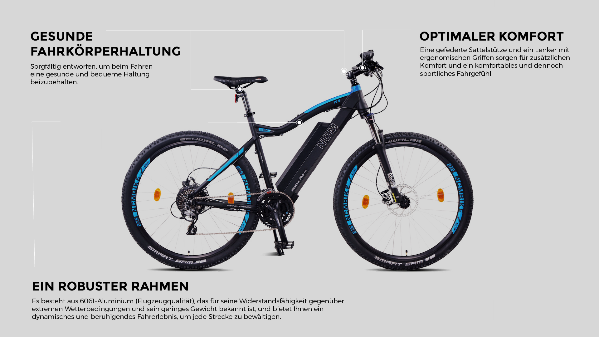 Für alle, die immer mehr wollen, ist das NCM Moscow Plus die leistungsstärkere Version des NCM Moscow. Ob auf unwegsamen Waldwegen oder Schotterpisten – es ist in seinem Element. Es wird selbst die höchsten Ansprüche von Abenteurern erfüllen.