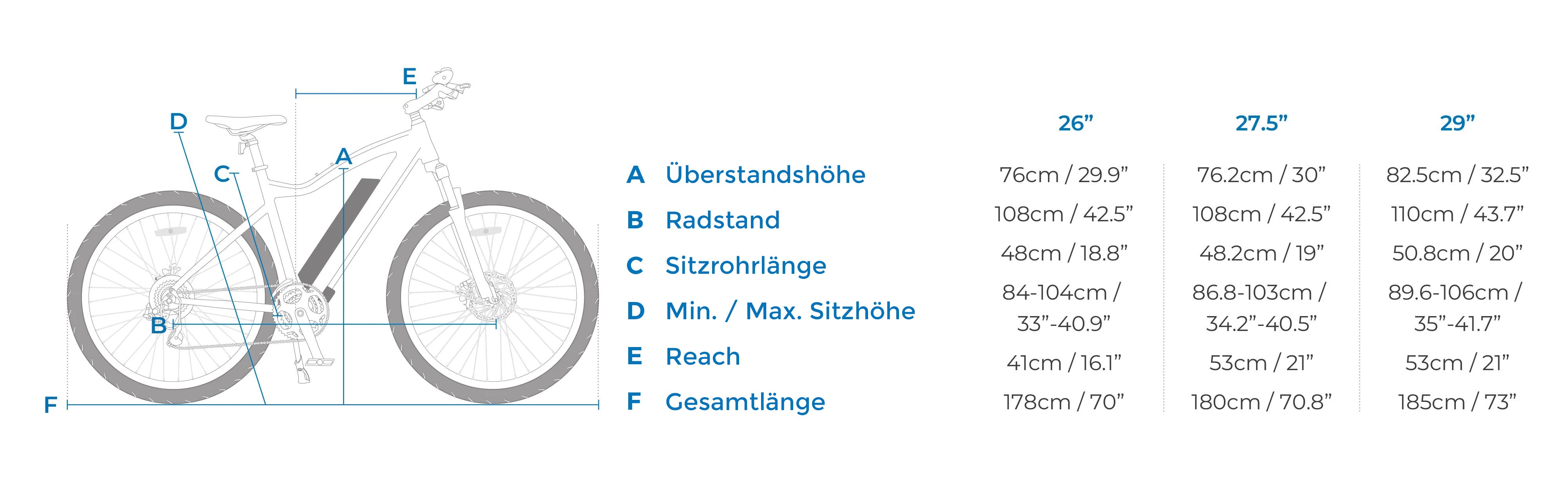 | Rahmen | Aluminium 6061, 27,5" × 480 mm / 29" × 520 mm |
