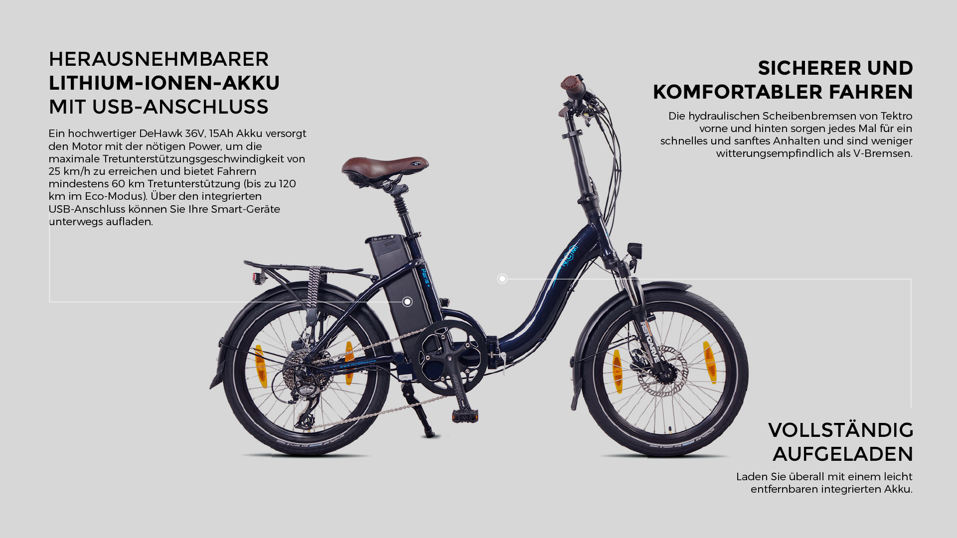 | Batterie | 36 V 19 Ah, mit USB-Anschluss. Durchschnittliche Reichweite: 60–120 km je nach Unterstützungsstufe. |