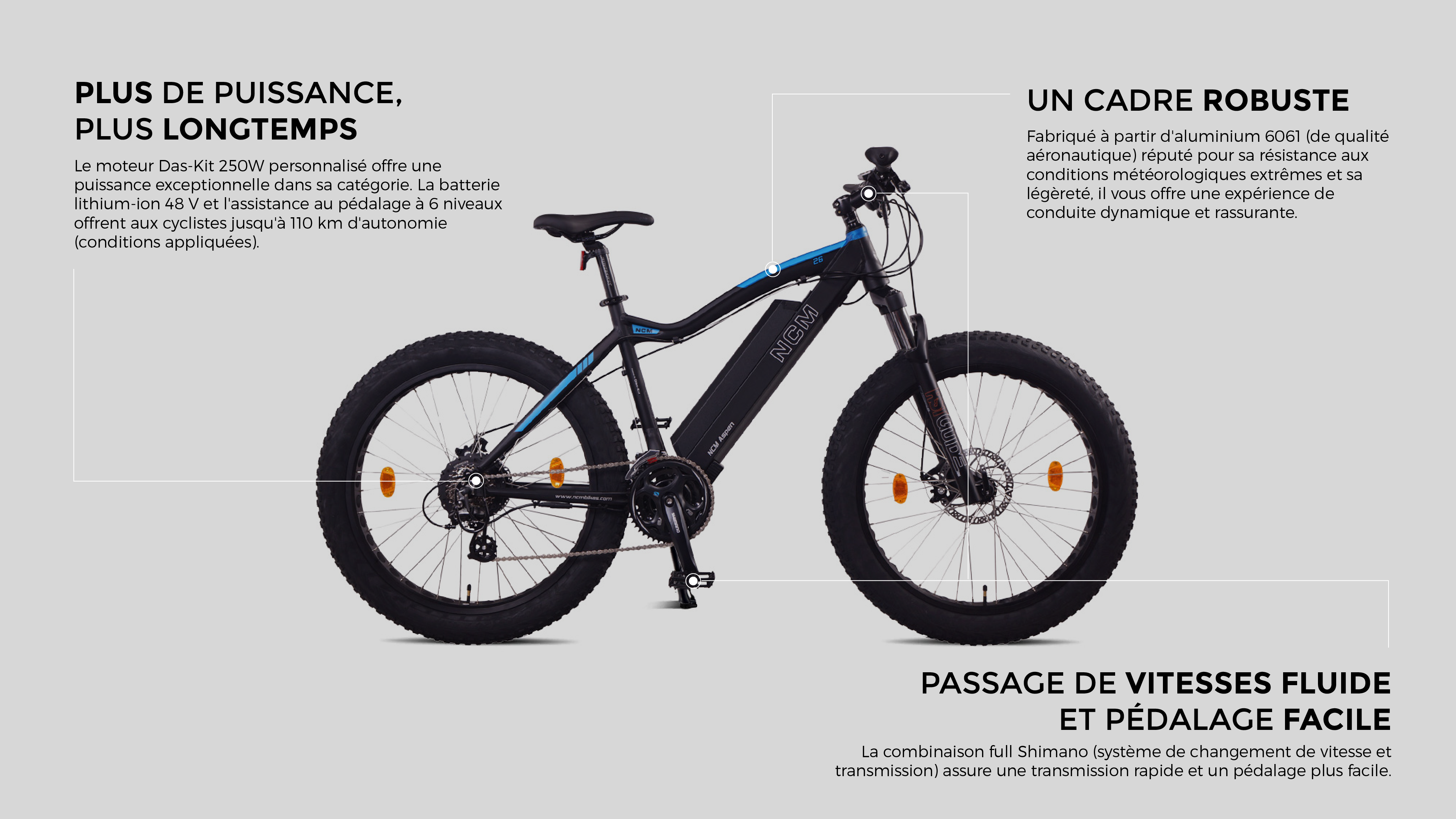 CONSTRUCTION ROBUSTE FAT BIKE POUR LA SÉCURITÉ : La conception du NCM Aspen est sportive, fonctionnelle et sûre. Avec un cadre en Aluminium, des freins à disque mécaniques Tektro, une fourche RST réglable spéciale Fat-Bike et des jantes et pneus ultra larges, vous êtes à l’aise et stable en toutes circonstances et sur tous terrains.