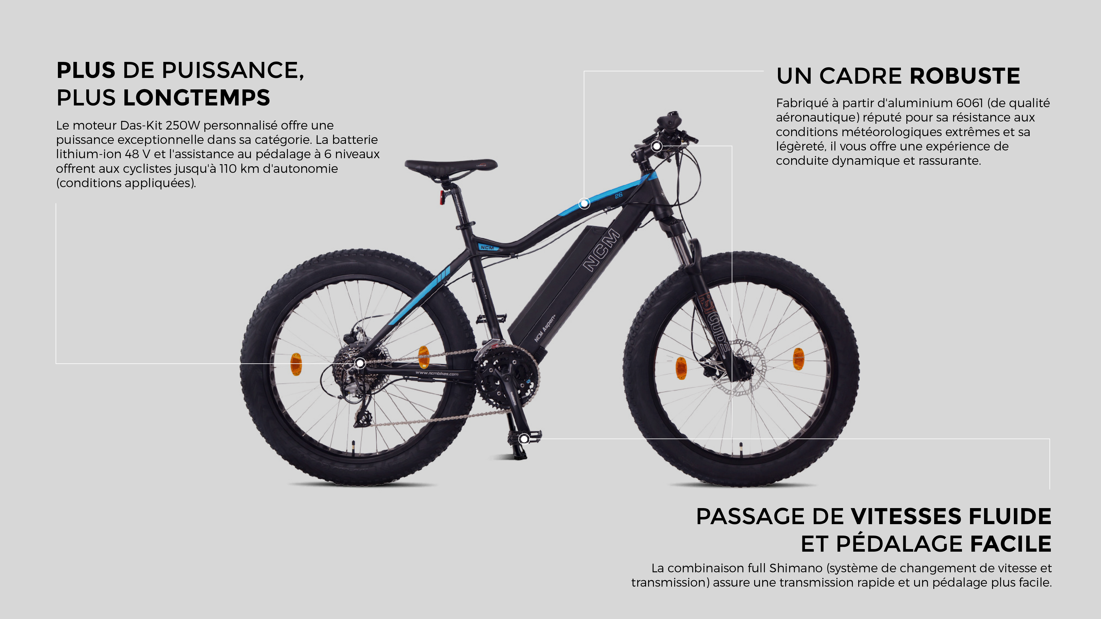 CONSTRUCTION ROBUSTE FAT BIKE POUR LA SÉCURITÉ : La conception du NCM Aspen+ est sportive, fonctionnelle et sûre. Avec un cadre en Aluminium, des freins à disque hydrauliques Tektro, une fourche RST réglable spéciale Fat-Bike et des jantes et pneus ultra larges, vous êtes à l’aise et stable en toutes circonstances et sur tous terrains.