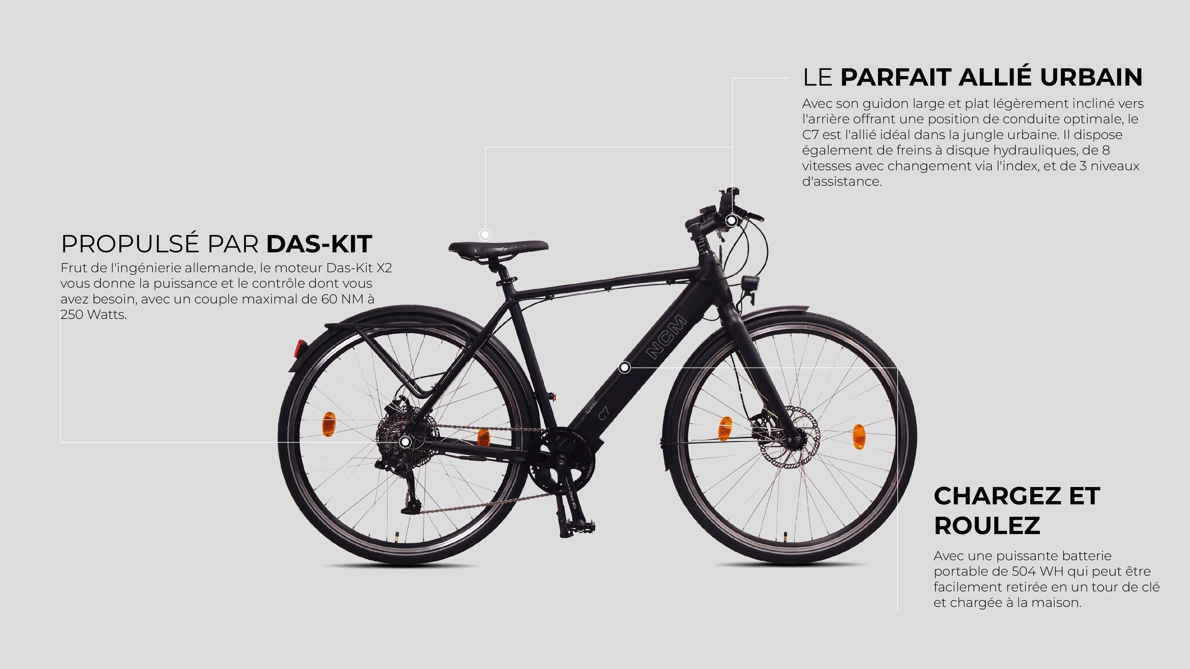 Le C7 est spécialement conçu pour les déplacements en ville et offre une grande polyvalence. Il se dote d'un design épuré avec une batterie entièrement intégrée et un cadre en aluminium qui en font le modèle NCM le plus léger. Équipé de l'écran Das-Kit E2 intégré au guidon du vélo pour un accès rapide et facile, il vous permet de paramétrer les 3 modes d'assistance électrique au pédalage. Vous pouvez garder à tout moment un œil sur le niveau de batterie du C7.