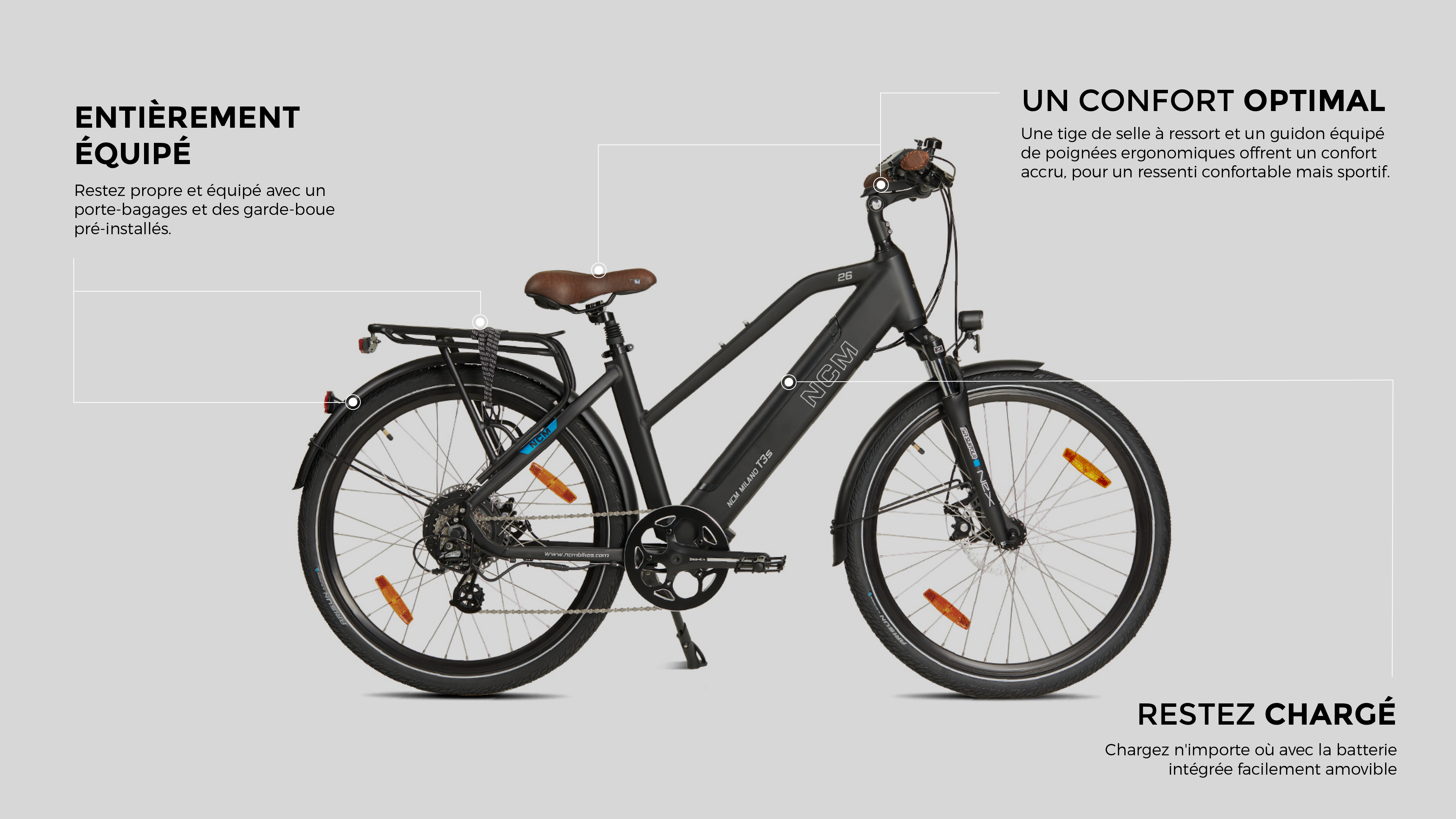 Le nouveau Milano T3s E-VTC est la toute nouvelle génération de la marque NCM. Successeur du modèle phare NCM Milano, il présente un nouveau design épuré, une ergonomie améliorée et une polyvalence prête à affronter tous les trajets, qu'ils soient courts ou longs. Le T3s offre plus de confort et de contrôle que jamais et garantit une conduite agréable grâce à une position assise droite, un cadre traversant bas et une optimisation de l'ergonomie avec un guidon réglable et une selle rembourrée en gel.